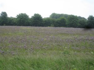 I think it’s flax – very pretty, and flower closes up at night (not that you’d stayed there long enough to notice!).