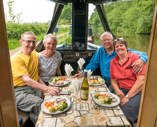 We moored up close to Shugborough Hall and enjoyed an excellent supper of herby loin of pork accompanied by a bottle of Nettie Viognier. This was followed by cherry pie with custard. You can see how we are enjoying our evenings. Please note the beautiful new tablecloth.